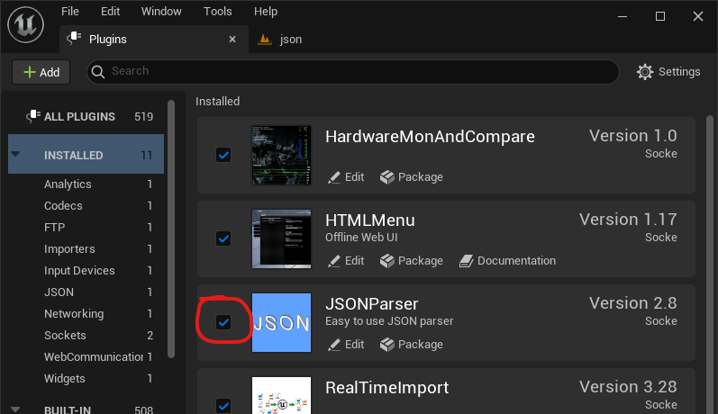 If you use the Unreal GIT version you have to copy the plugin into your project: D:\myproject\Plugins\JSONParser