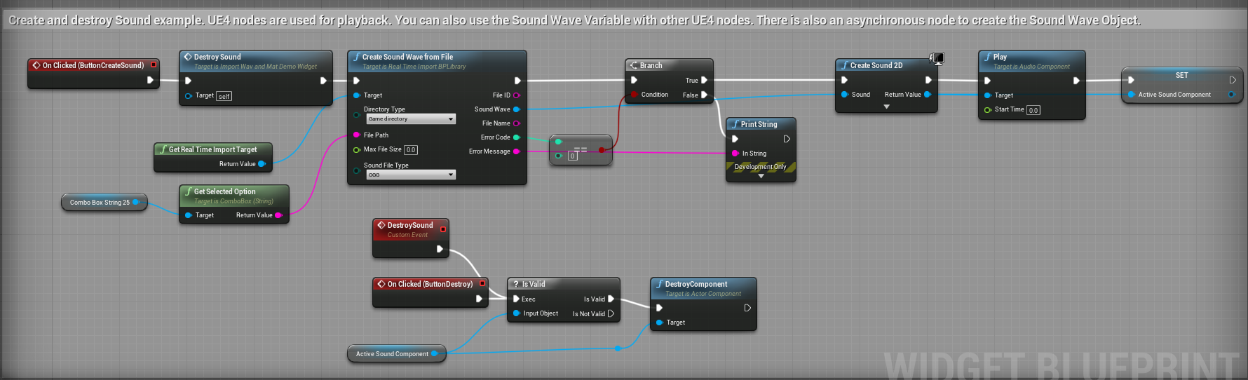 In this example the file test.ogg is played in the project\content directory. The error code 0 means there were no errors. If there were no errors the FileID is stored in a variable. This ID is needed for further functions as shown on the screenshots. The event should be executed only once. I used the "Do Once" node here. The events can also be created in "Event Begin Play" or "Event Begin Construct".