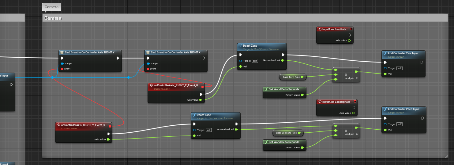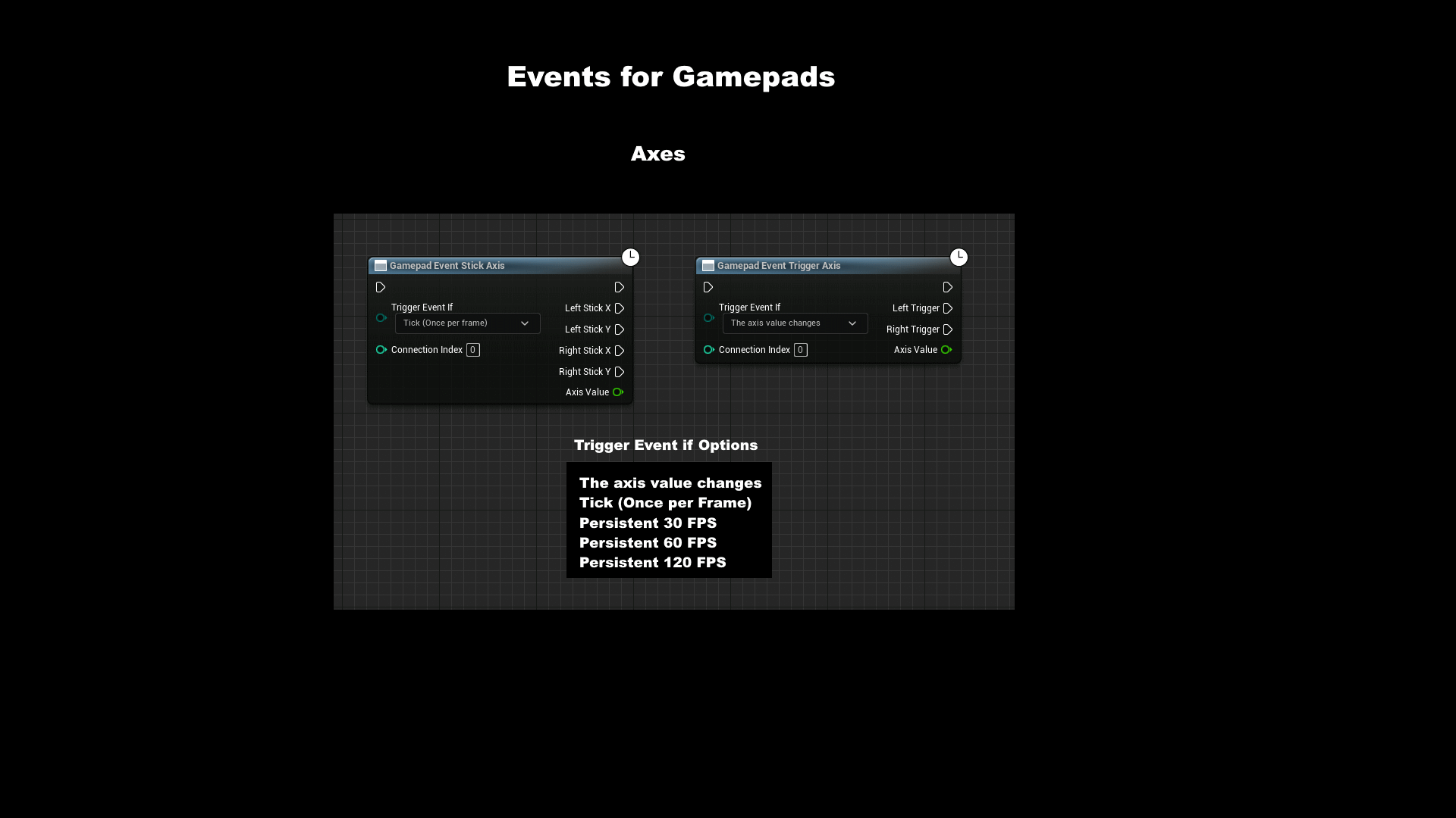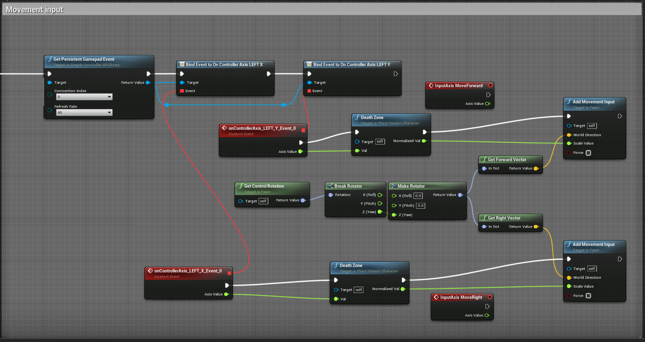 Next, we will create a "Persistent" event to replace the "InputAxis" events. This event fires the current position of the gamepad axes all the time. The refresh rate should be equal or higher than the frame rate. Otherwise the character wobbles because he gets the values too rarely.