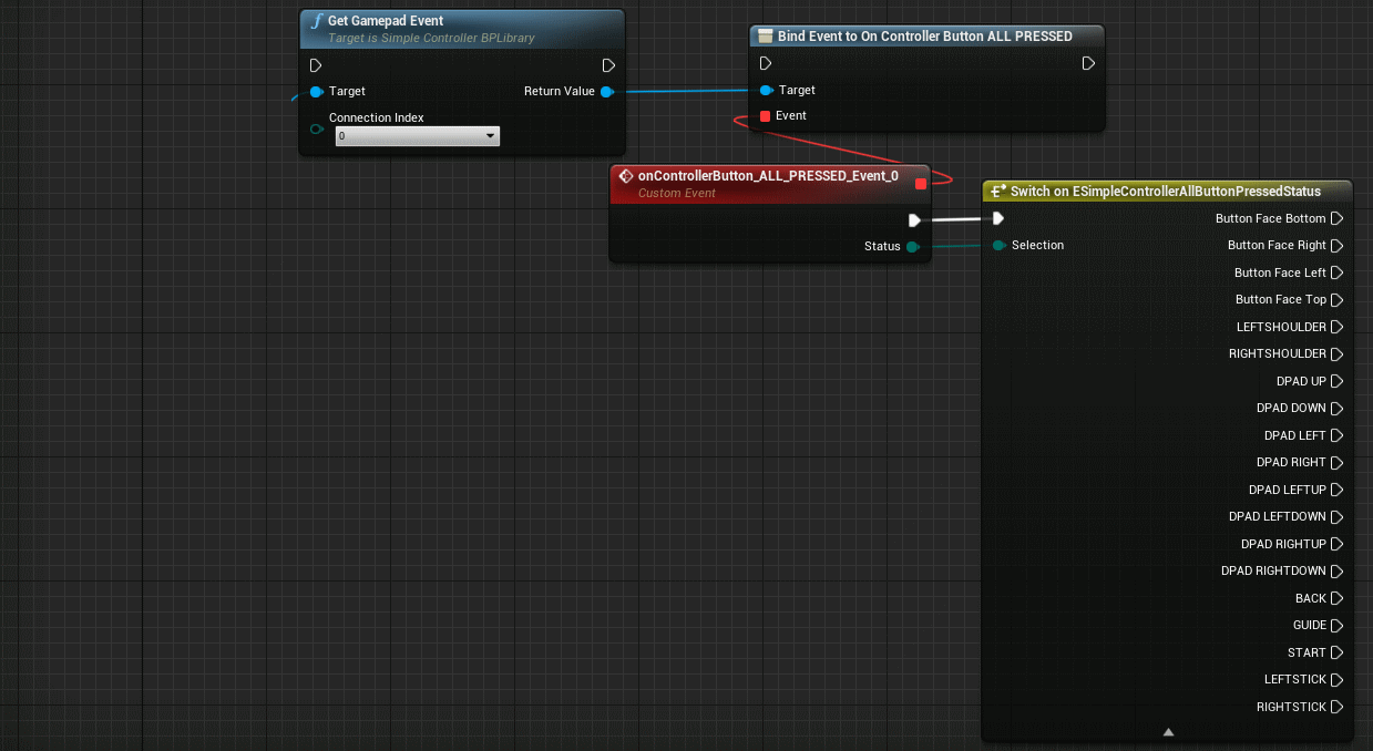 Then we register the "Face Button Bottom" event. This is the bottom Button so A on Xbox and X on Playstation and we make a switch on Status.
