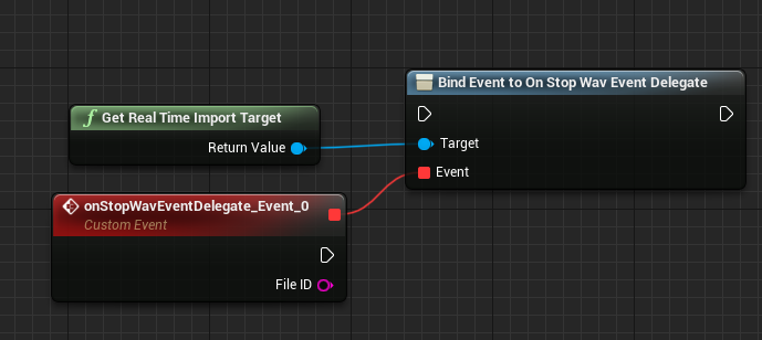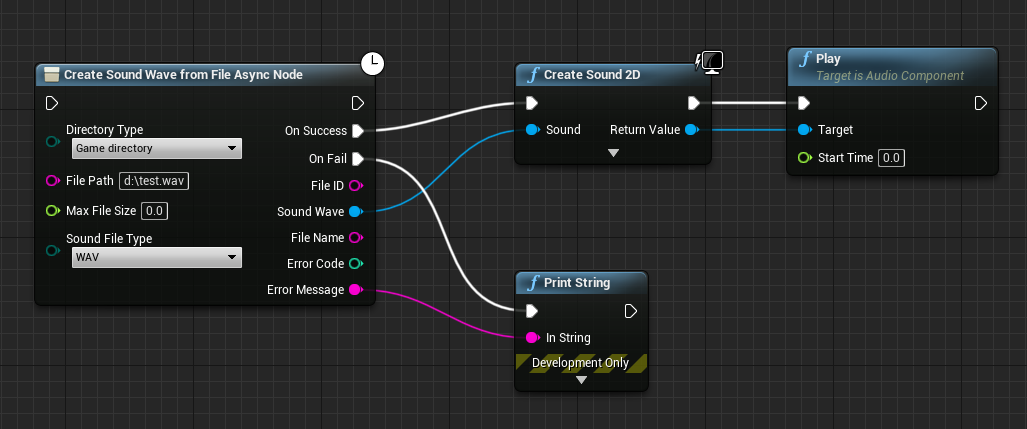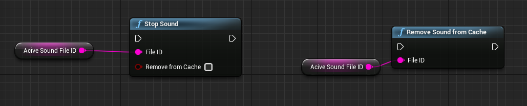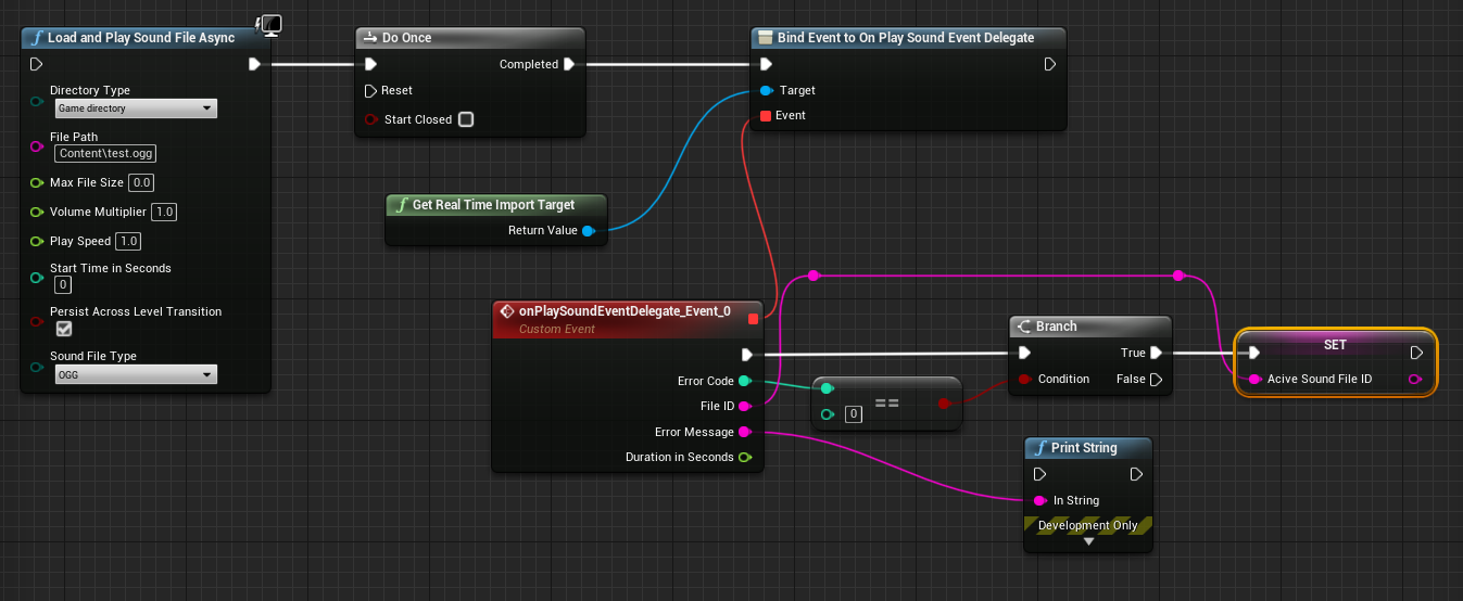 In this example the file test.ogg is played in the project\content directory. The error code 0 means there were no errors. If there were no errors the FileID is stored in a variable. This ID is needed for further functions as shown on the screenshots. The event should be executed only once. I used the "Do Once" node here. The events can also be created in "Event Begin Play" or "Event Begin Construct".