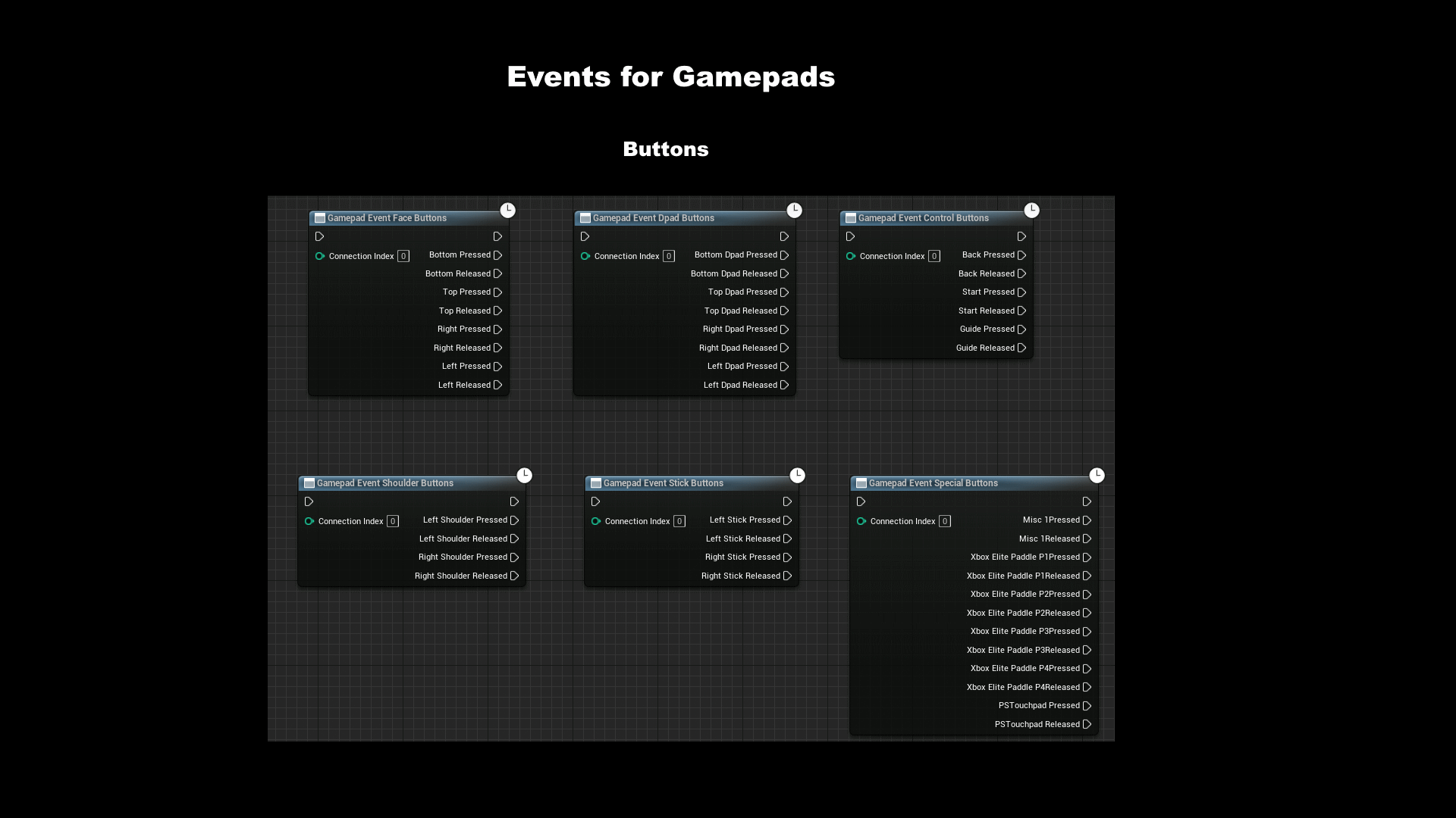 Since version 1.6 there are new evens and functions specially for gamepads. They are more similar to the Unreal functions.