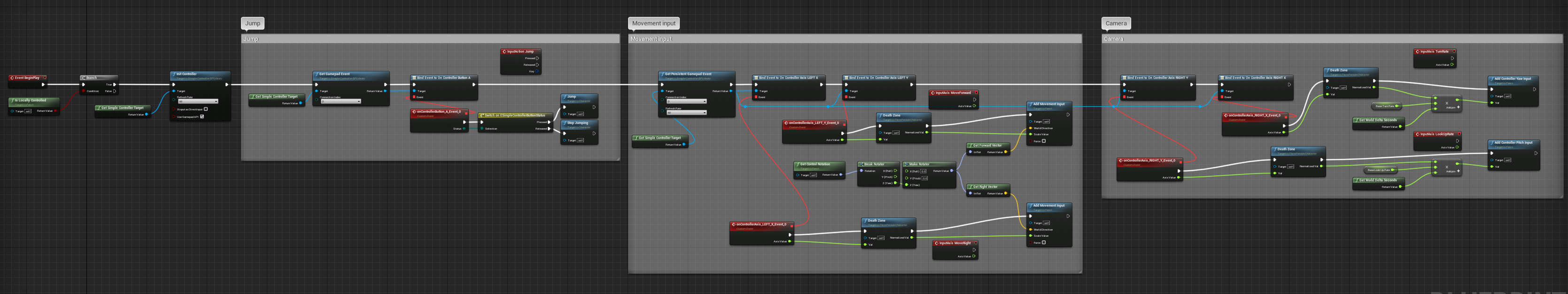 Next, we will create a "Persistent" event to replace the "InputAxis" events. This event fires the current position of the gamepad axes all the time. The refresh rate should be equal or higher than the frame rate. Otherwise the character wobbles because he gets the values too rarely.