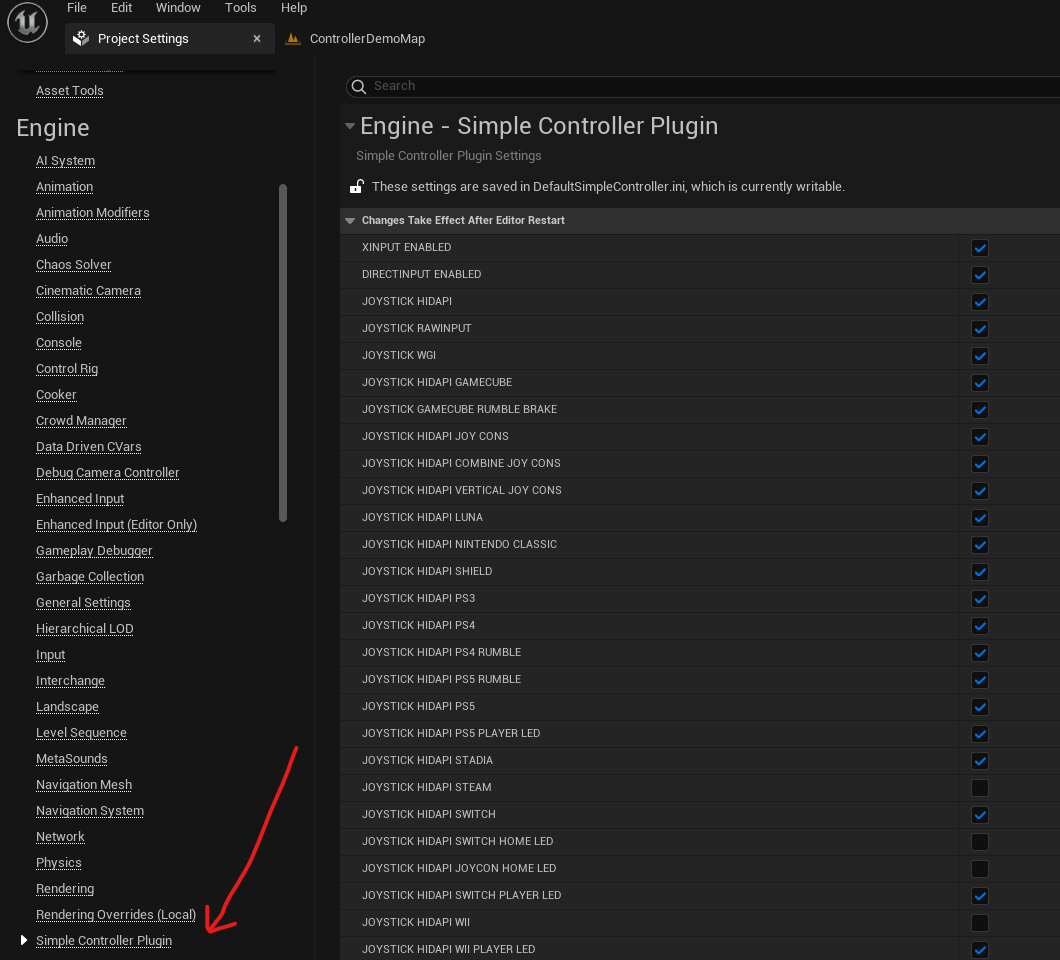 Since plugin version 3.4, the settings can be made under "Project Settings -> Engine -> Simple Controller Plugin". The editor must be restarted after making changes.