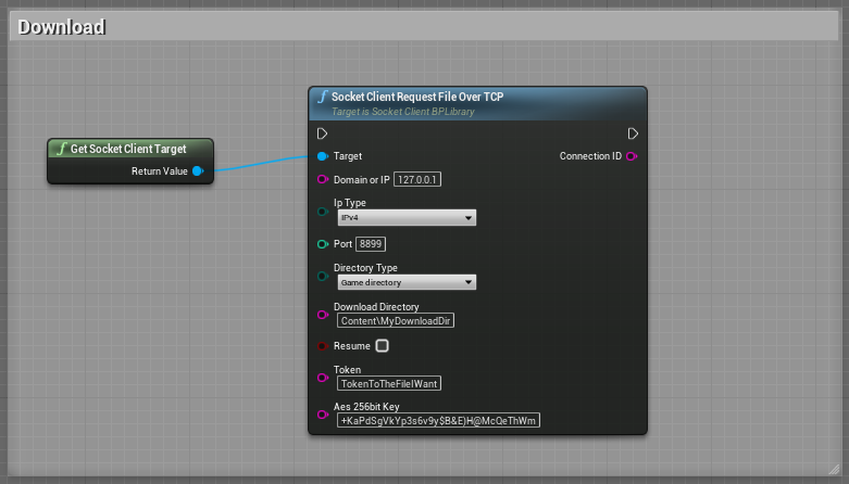 The "Socket Client Request File Over TCP" function can be used to request a file from the server. Which file is controlled by the token. The server sends the file if all parameters are correct. The connection is also terminated here after the transmission.