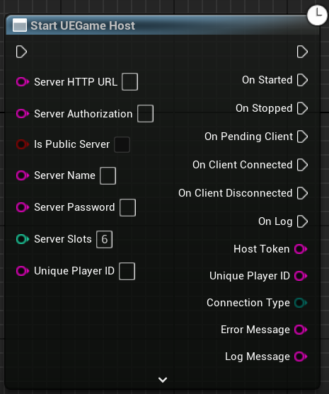 The Start UEGameHost function can be found in the "HostPluginGameInstance". This function is used to start a multiplayer game.